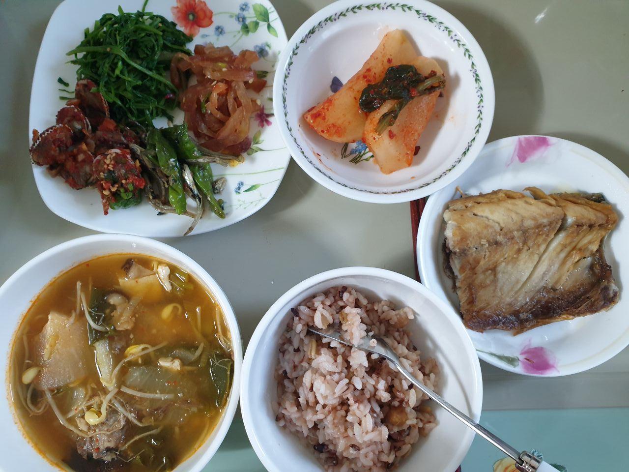 또 꼬막무침과 미나리 나물, 고등어 구이, 조기 구이, 꾀리고추 멸치볶음, 미역줄기 볶음, 마늘 장아찌, 짠무채 양념무침, 무나물, 콩나물, 도자리 오이무침 등 다양한 반찬이 있어 언제 가도 평소에 먹고 싶었던 반찬을 듬뿍 사올 수 있어 너무 만족스럽다. 맛도 질리지 않는 집반찬 맛이다. 미리 플라스틱 반찬그릇에 담아놓은 것도 있지만 원하는 대로 새로 담아주기도 한다. 특히 싱싱한 김치, 막 버무린 겉절이, 깍뚜기, 총각김치, 나박김치, 동치미 등 김치 종류도 다양하다. 국과 찌개 종류도 여러가지 준비돼있다. 오늘은 선지해장국, 미역국, 아욱된장국, 청국장, 너무 종류가 다양해서 기억도 다 나지 않을 정도다.