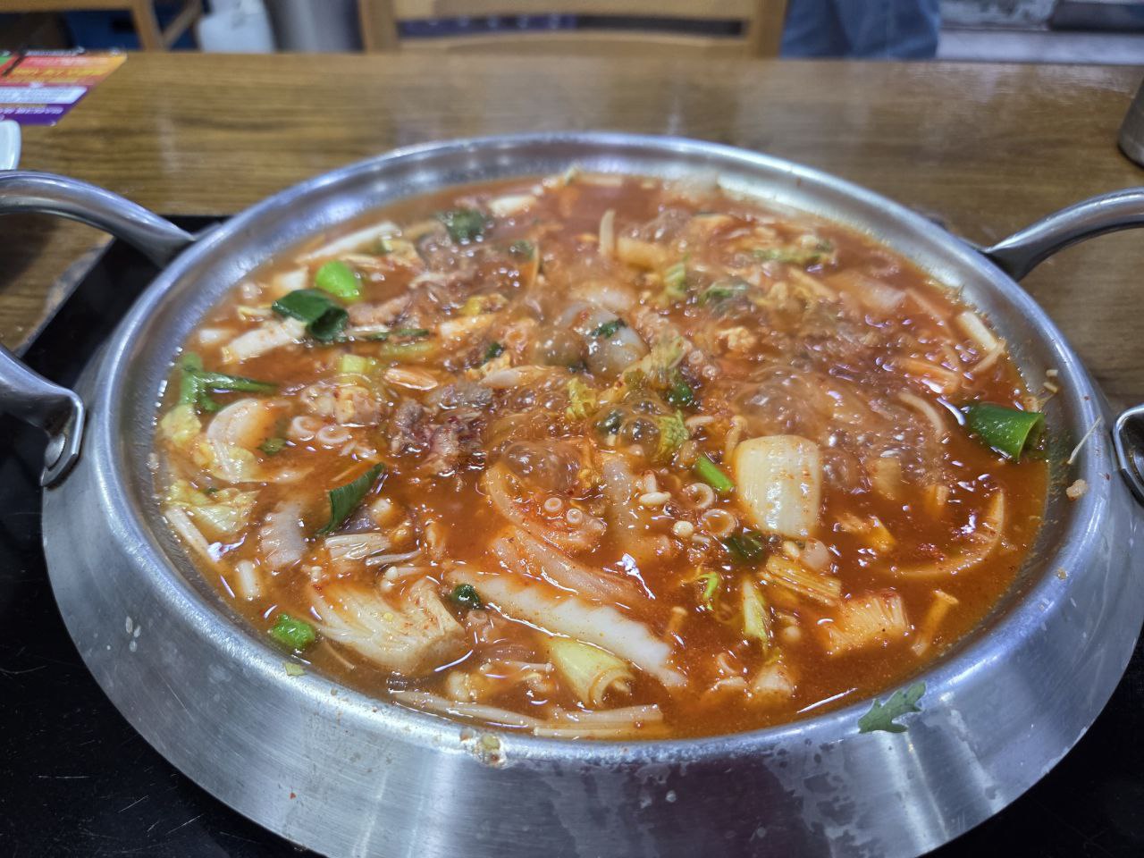 ‘충무할매낙지’에서 주문한 메뉴는 불낙전골. 낙지와 불고기를 함께 넣고 칼칼한 양념장에 끓여낸 국물 요리로, 1인 15,000원의 가격이 전혀 아깝지 않은 알찬 구성입니다.