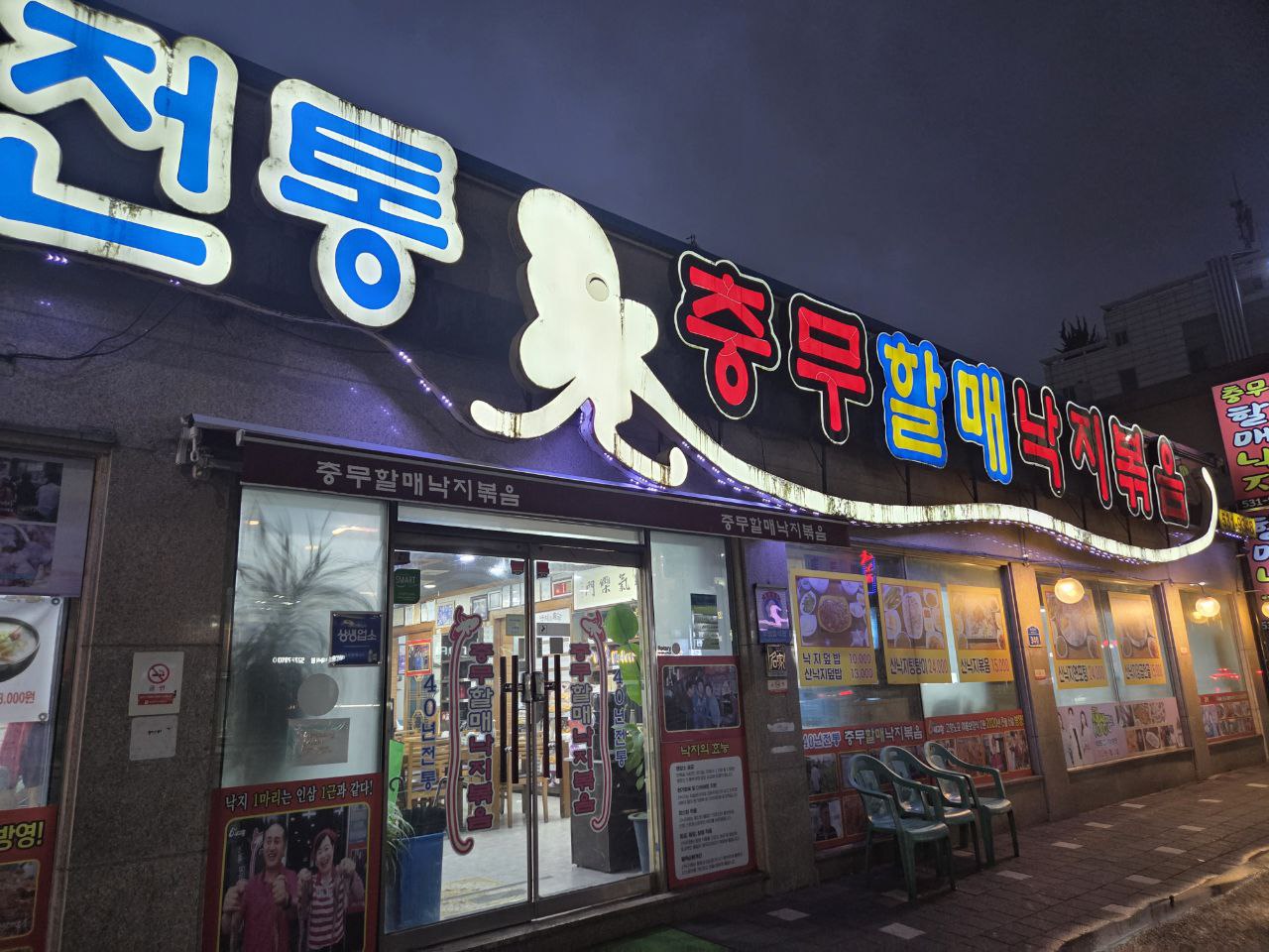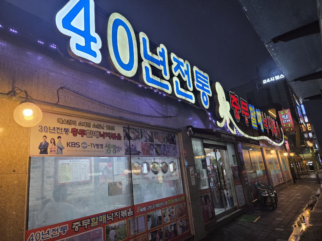 대전 서구 용문동, 비가 조용히 내리던 어느 저녁. 어두운 하늘 아래 우산을 쓰고 걷다 보니 대로변에서 눈에 띄는 간판 하나가 반짝입니다. “충무할매낙지볶음”, “40년 전통”, “TV방영 맛집”이라는 문구가 빛나는 파란 네온과 함께 강렬하게 시선을 사로잡습니다.
