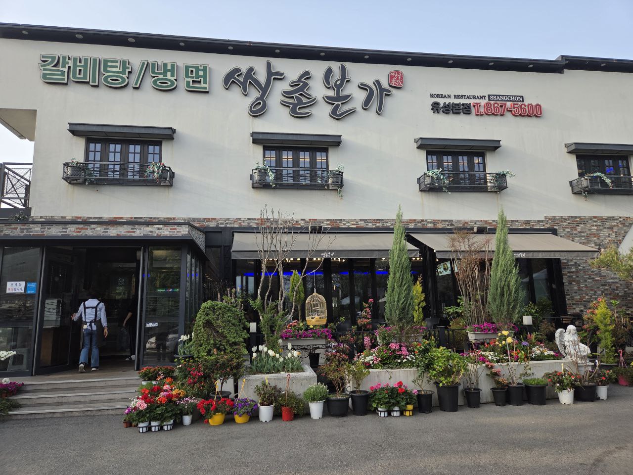 봄 햇살이 포근하게 내리던 날 오후, 대전 유성구에 위치한 '쌍촌본가'를 찾았습니다. 식당 앞에 도착하자마자 눈에 들어온 건 다채로운 색의 꽃들. 화분마다 정성스럽게 가꾼 듯 생기 가득한 봄꽃들이 식당 입구를 환하게 밝혀주고 있었어요. 마치 작은 정원에 들어서는 기분이랄까요? 꽃 사이로 앙증맞은 새장도 눈에 띄었고, 예쁘게 다듬어진 나무와 조형물들이 어우러져 이곳이 단순한 식당이 아닌, 정원 같은 힐링 공간임을 느끼게 해줬습니다.