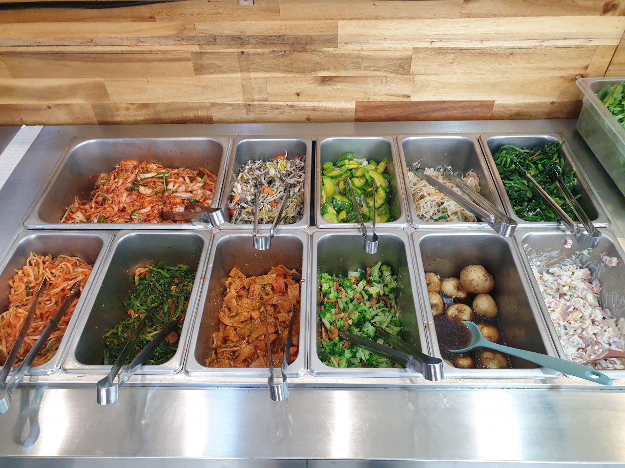 반찬 구성은 더 놀라웠다. 도토리묵에 감칠맛 가득한 양념장이 얹혀 나오고, 시금치, 숙주나물, 미나리무침 같은 나물 반찬은 입맛을 개운하게 잡아주었다. 여기에 고소한 버섯볶음과 부드러운 호박나물, 달짝지근한 감자 통조림과 무우 생채, 짭조름한 오뎅조림까지. 브로콜리와 새우를 함께 볶은 반찬은 색감과 영양 모두 잡은 인기 메뉴다.